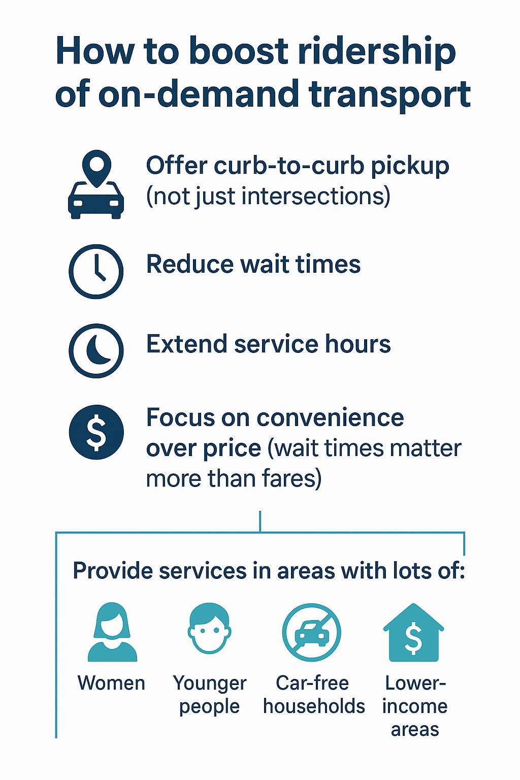 - In terms of service design, waiting time, service hours, and pick-up/drop-off policies exert the largest influence on ridership.