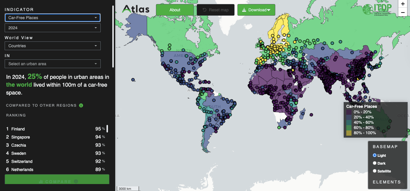 The ITDP has launched an Atlas for sustainable transport. It contains measurements of nine indicators for cities all around the world. It includes over 40,000 localities in over 1,000 urban areas, calculated from open-source data.