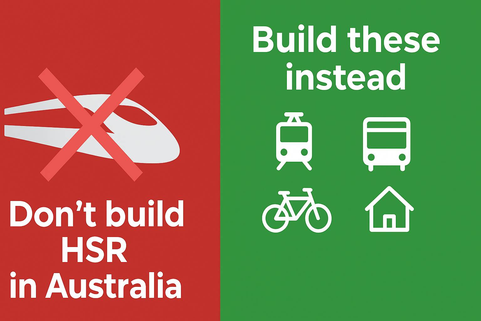For the cost of this HSR project, we could transform transport in every Australian capital city. We could build light rail networks, bus rapid transit systems, and world-class cycling infrastructure. We could enable tens of thousands of homes near existing stations with the schools and libraries to support them. We could fund sustainable aviation fuels that would benefit all flights, not just domestic ones.