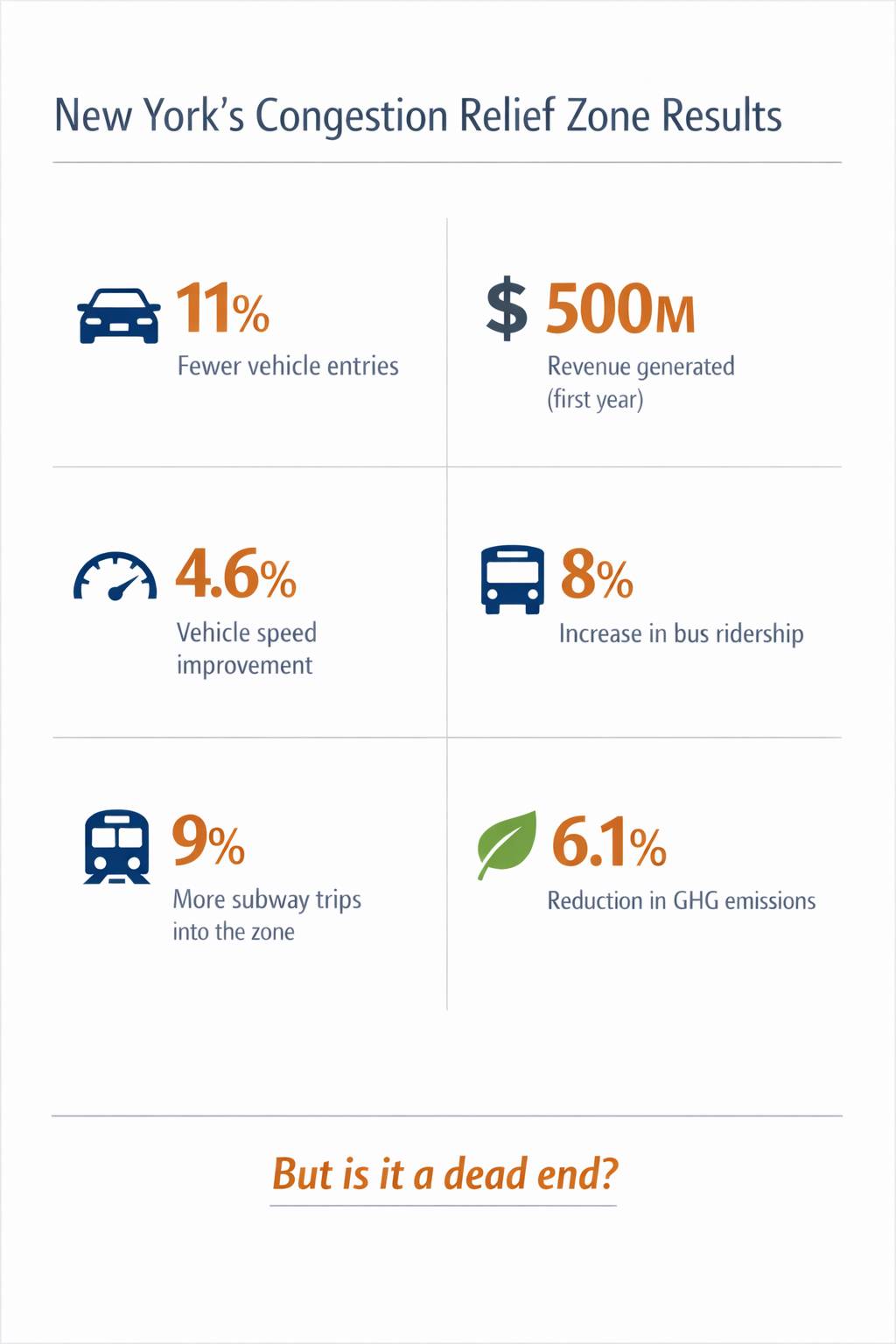 - Vehicle speeds improved 4.6%. The tolls are shifting traffic to times when the street network has more spare capacity, reducing overall congestion.
